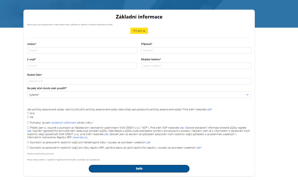 Otevřete si stránky www.viva-credit.cz a klikněte na “požádejte teď” nebo v horní části stránky na “Požádat o půjčku”. Otevře se první strana formuláře žádosti o půjčku.